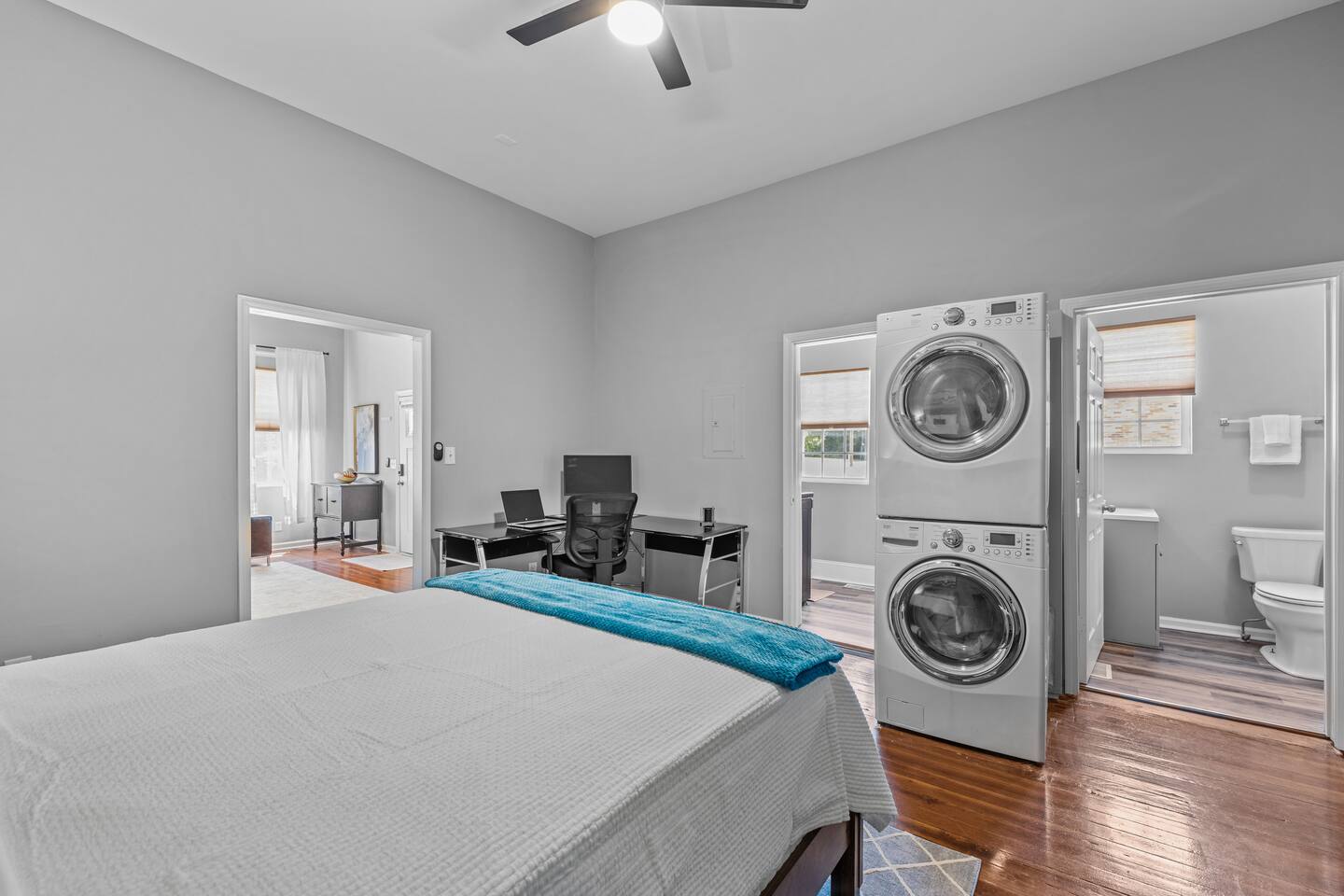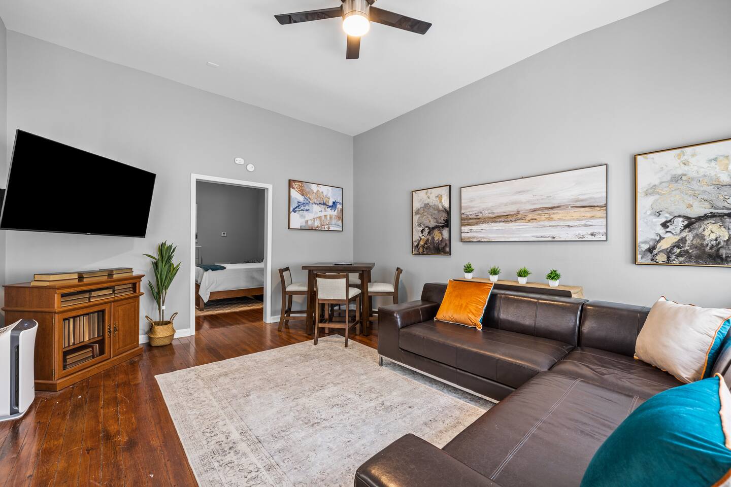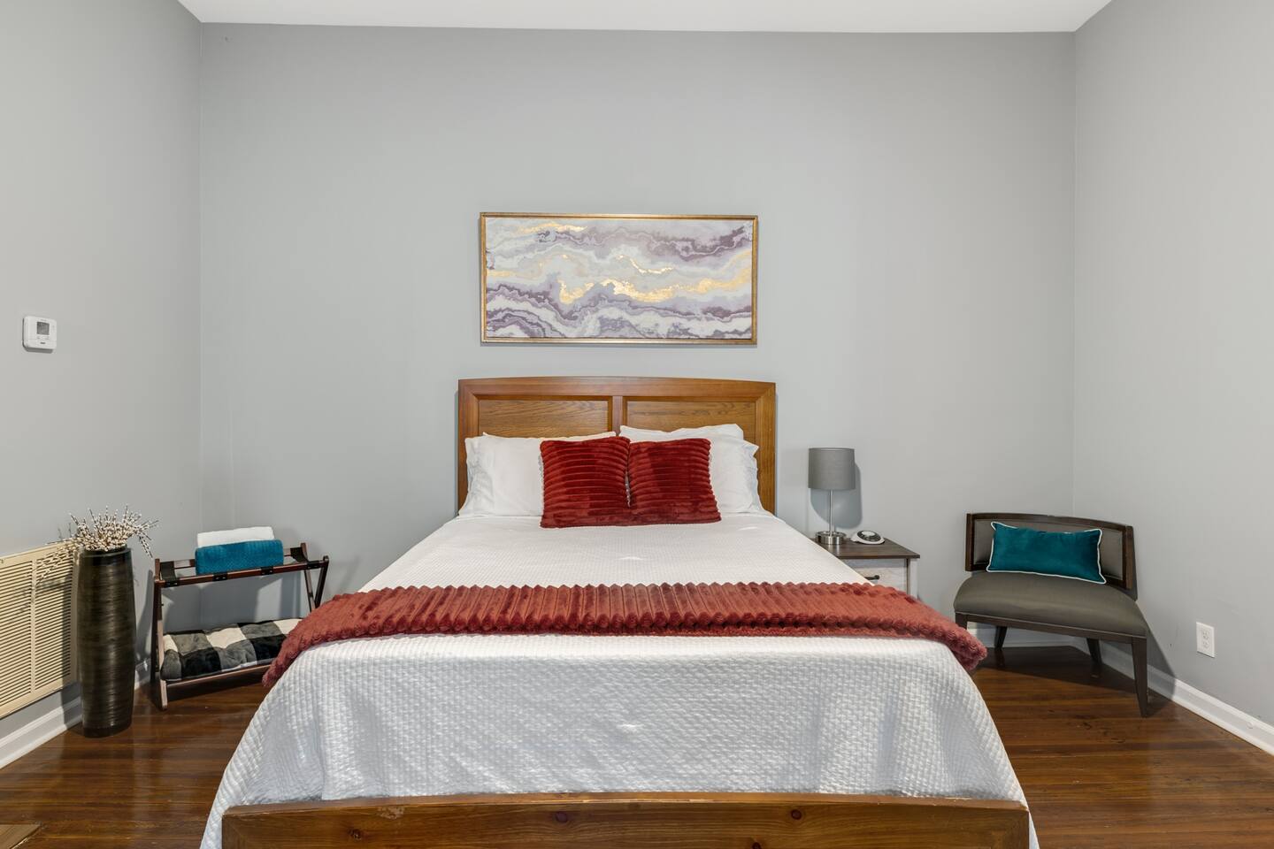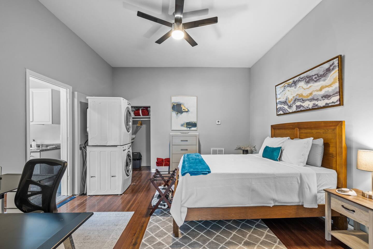 Note: You must walk through the primary bedroom to access the bathroom and kitchen. Drive an EV!? We have two chargers (level 2)! The flat has one bedroom with a queen bed, a queen-size sofa bed, and a dedicated work desk space with a second screen to plug in. There is also fast high-speed Internet, a full kitchen, and a full-size washer/dryer. The unit has a portable crib/playpen. Updated stainless steel appliances Lots of windows Tall ceilings and very spacious minimalist and clean design Enjoy free parking, RIGHT OUTSIDE the front door. This is a location just a half mile from the HEART OF DOWNTOWN, and the perfect place for remote workers, traveling families, or anyone in town for an event!