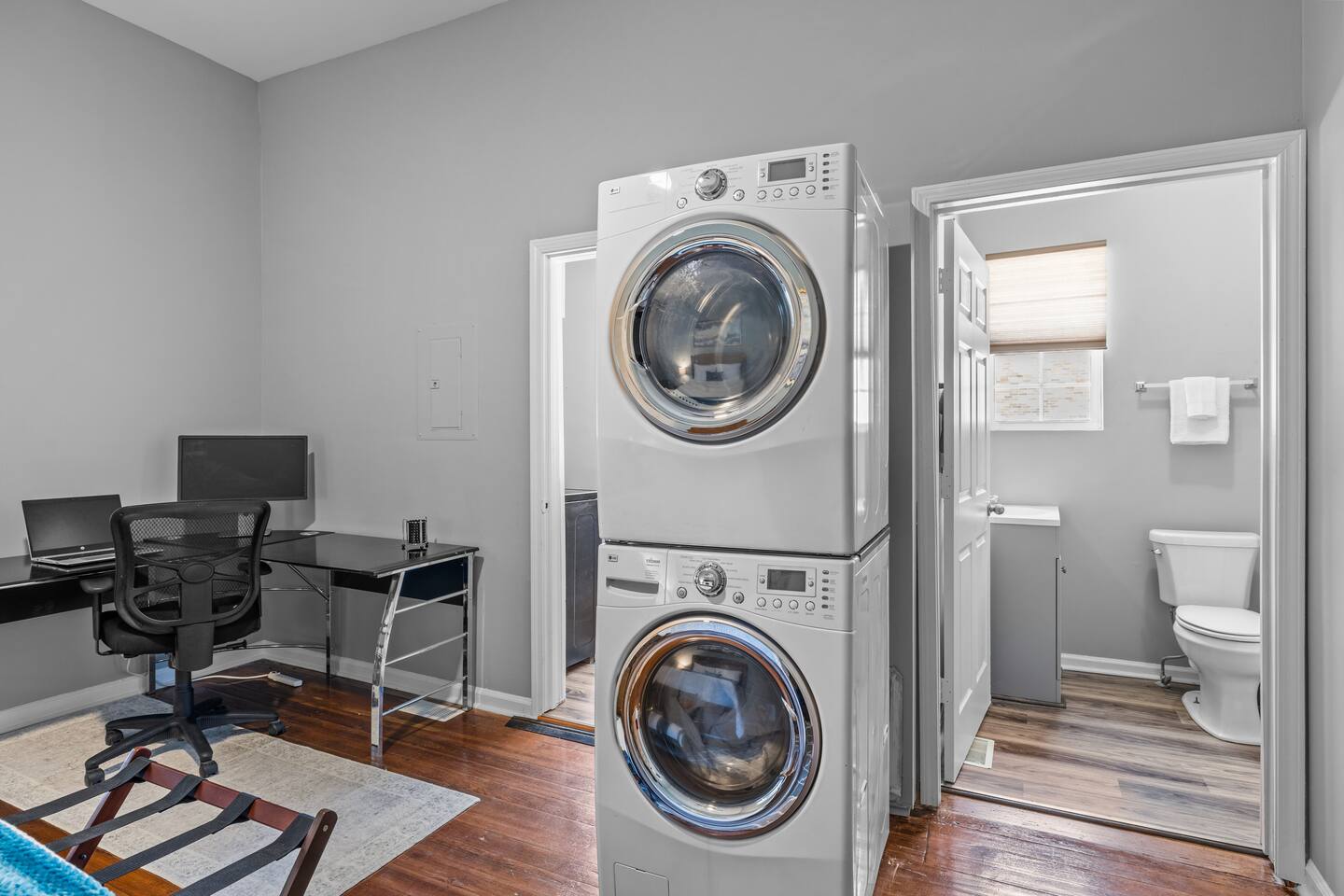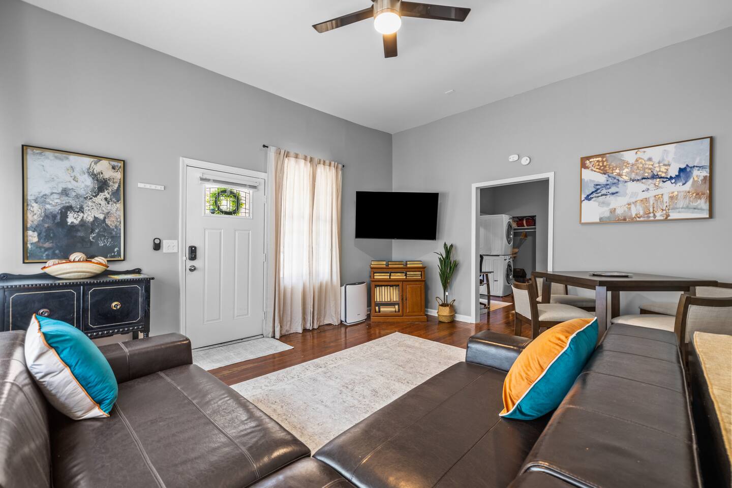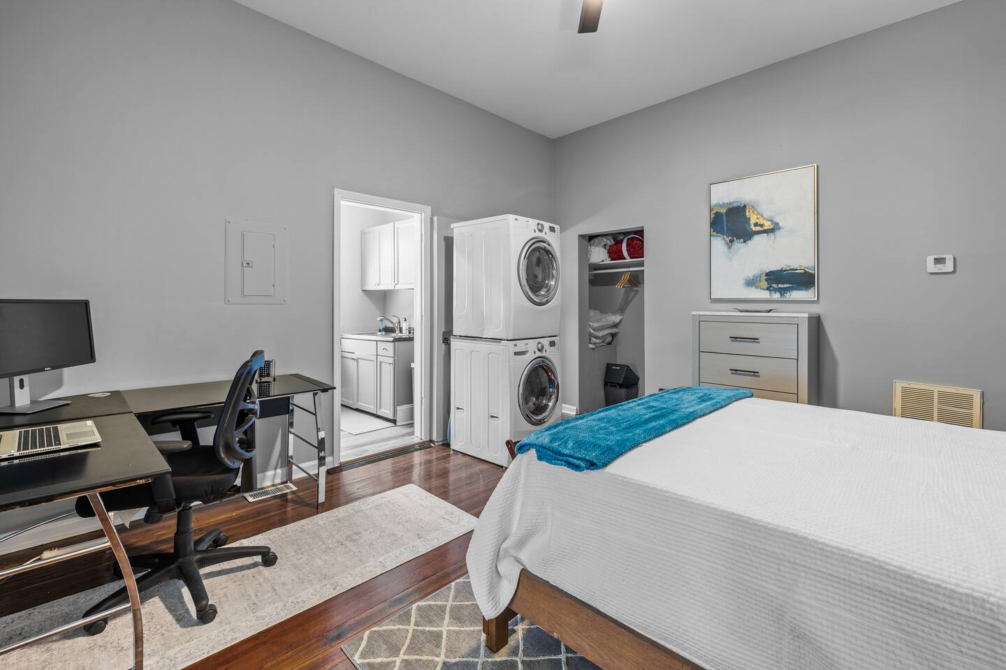 Note: You must walk through the primary bedroom to access the bathroom and kitchen. Drive an EV!? We have two chargers (level 2)! The flat has one bedroom with a queen bed, a queen-size sofa bed, and a dedicated work desk space with a second screen to plug in. There is also fast high-speed Internet, a full kitchen, and a full-size washer/dryer. The unit has a portable crib/playpen. Updated stainless steel appliances Lots of windows Tall ceilings and very spacious minimalist and clean design Enjoy free parking, RIGHT OUTSIDE the front door. This is a location just a half mile from the HEART OF DOWNTOWN, and the perfect place for remote workers, traveling families, or anyone in town for an event!