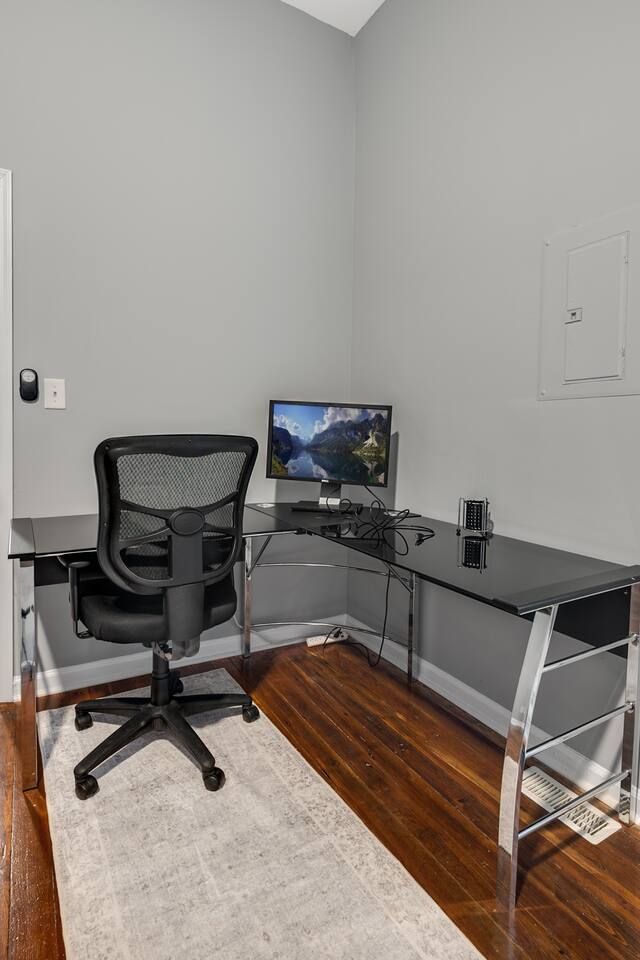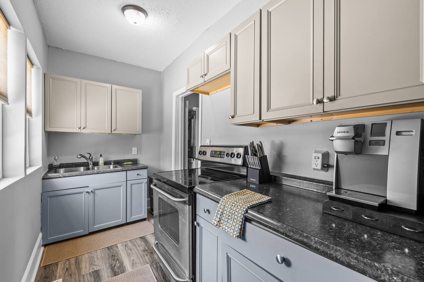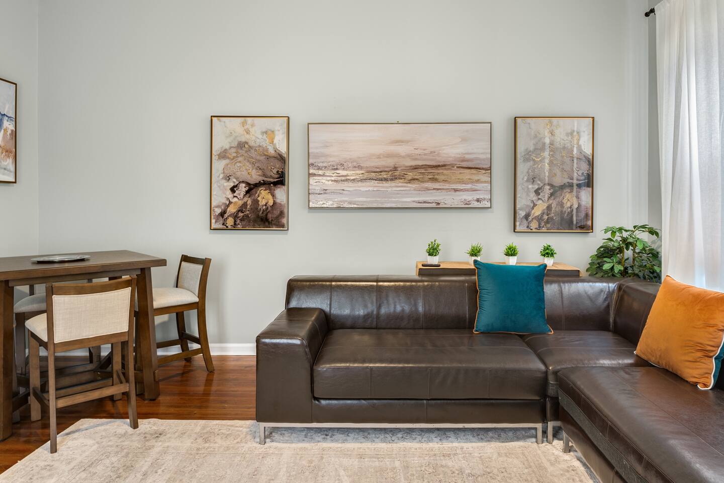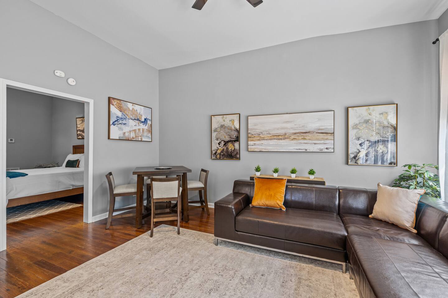 Note: You must walk through the primary bedroom to access the bathroom and kitchen. Drive an EV!? We have two chargers (level 2)! The flat has one bedroom with a queen bed, a queen-size sofa bed, and a dedicated work desk space with a second screen to plug in. There is also fast high-speed Internet, a full kitchen, and a full-size washer/dryer. The unit has a portable crib/playpen. Updated stainless steel appliances Lots of windows Tall ceilings and very spacious minimalist and clean design Enjoy free parking, RIGHT OUTSIDE the front door. This is a location just a half mile from the HEART OF DOWNTOWN, and the perfect place for remote workers, traveling families, or anyone in town for an event!